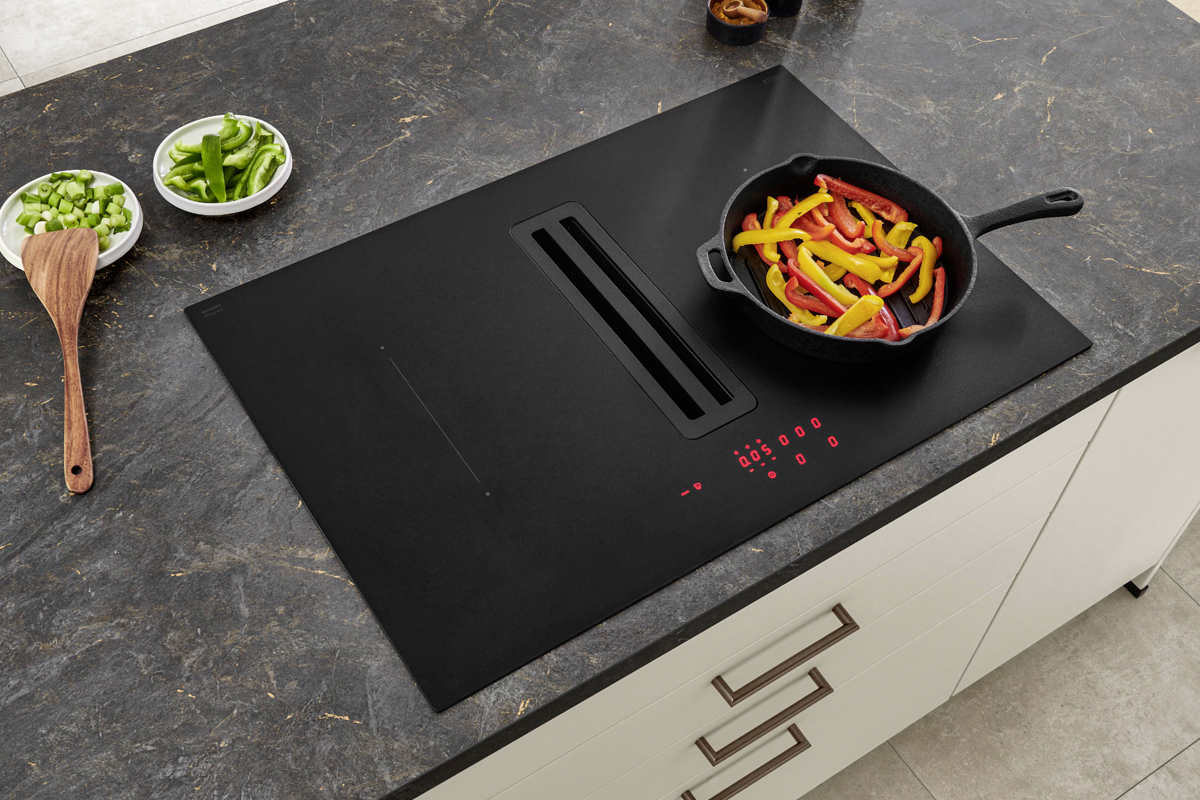 Kookveldafzuiging revolutioneert de afzuiging in de keuken: Damp en geuren worden direct bij het kookveld weggezogen, waardoor hinderlijk opstijgende kookdampen voorkomen worden. Deze ruimtebesparende techniek zorgt niet alleen voor een heldere zichtlijn en frisse lucht, maar biedt ook de vrijheid om het kookveld flexibel te plaatsen – ideaal voor open keukenconcepten.