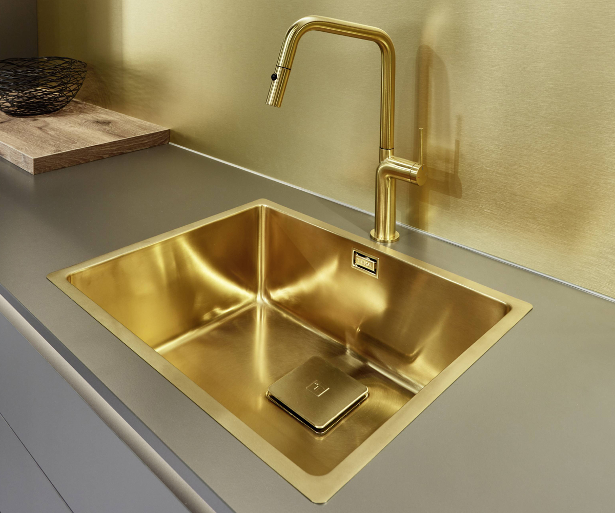 Elke keuken verdient een mooie spoelbak. Gouden kleuraccenten in het interieur zijn absoluut trendy en ook een geweldige blikvanger. Combineer expressieve kleuren met goudkleurige details voor een exclusieve en unieke look.
