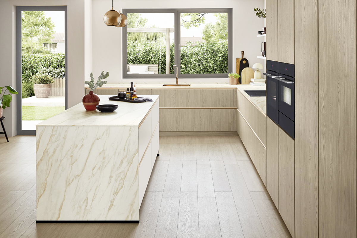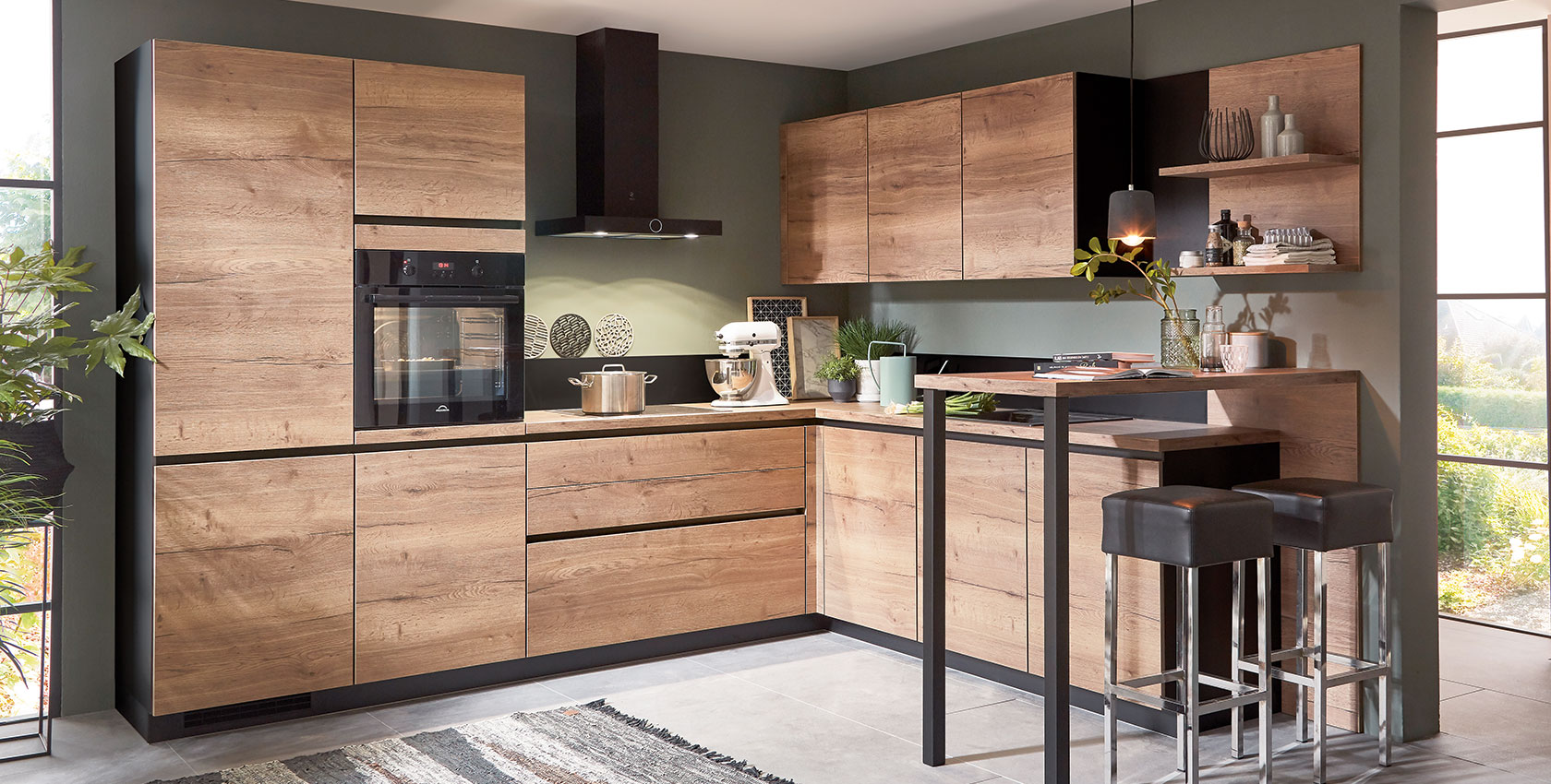 Moderne houtdecors zijn helemaal in en zorgen voor een warme, uitnodigende sfeer. Extra spannend wordt het in combinatie met natuurlijke materialen zoals steen, die het design een eigentijdse en elegante touch geven. Onze keukens combineren deze moderne look met ultieme functionaliteit en bieden comfort van topniveau – stijlvol én gezellig tegelijk.