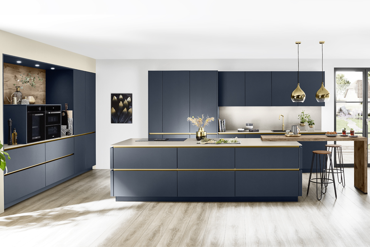 Greeploze loftkeuken Nobilia Senso LineN, ca. 366 / 107 x 300 cm, front: lak, schiefer grijs premium mat, werkblad: composiet, bar noten Milano
