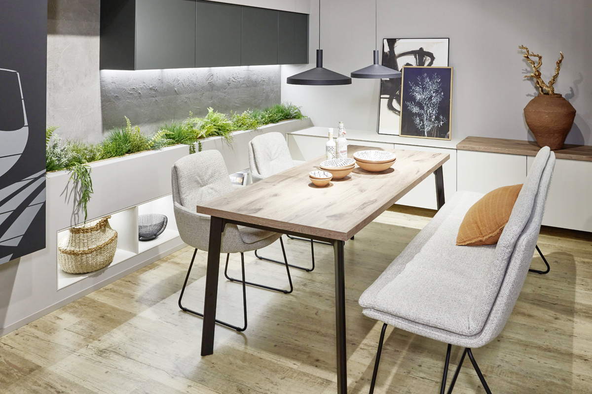 Een eettafel moet een blikvanger zijn, maar moet ook in de sfeer van de keuken en de woonkamer passen. Erg stijlvol is het wanneer het tafelblad perfect bij het werkblad van de designkeuken past. En net dat bieden we met onze nieuwe reeks eettafels.